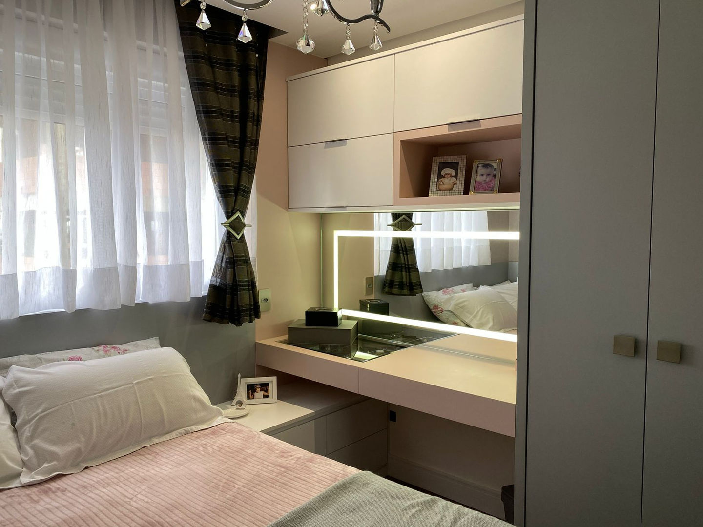 A reforma deste apartamento de 80m² em Curitiba, ganha destaque na elegância do mármore Paraná na cozinha, combinado com painéis em madeira que trazem sofisticação e aconchego aos ambientes. Os tons claros e iluminação indireta embutida na marcenaria, criam uma atmosfera acolhedora e funcional. No quarto, projetado para uma menina, foi utilizado tons delicados de rosé e cinza, e uma penteadeira iluminada, trazendo charme e sofisticação.